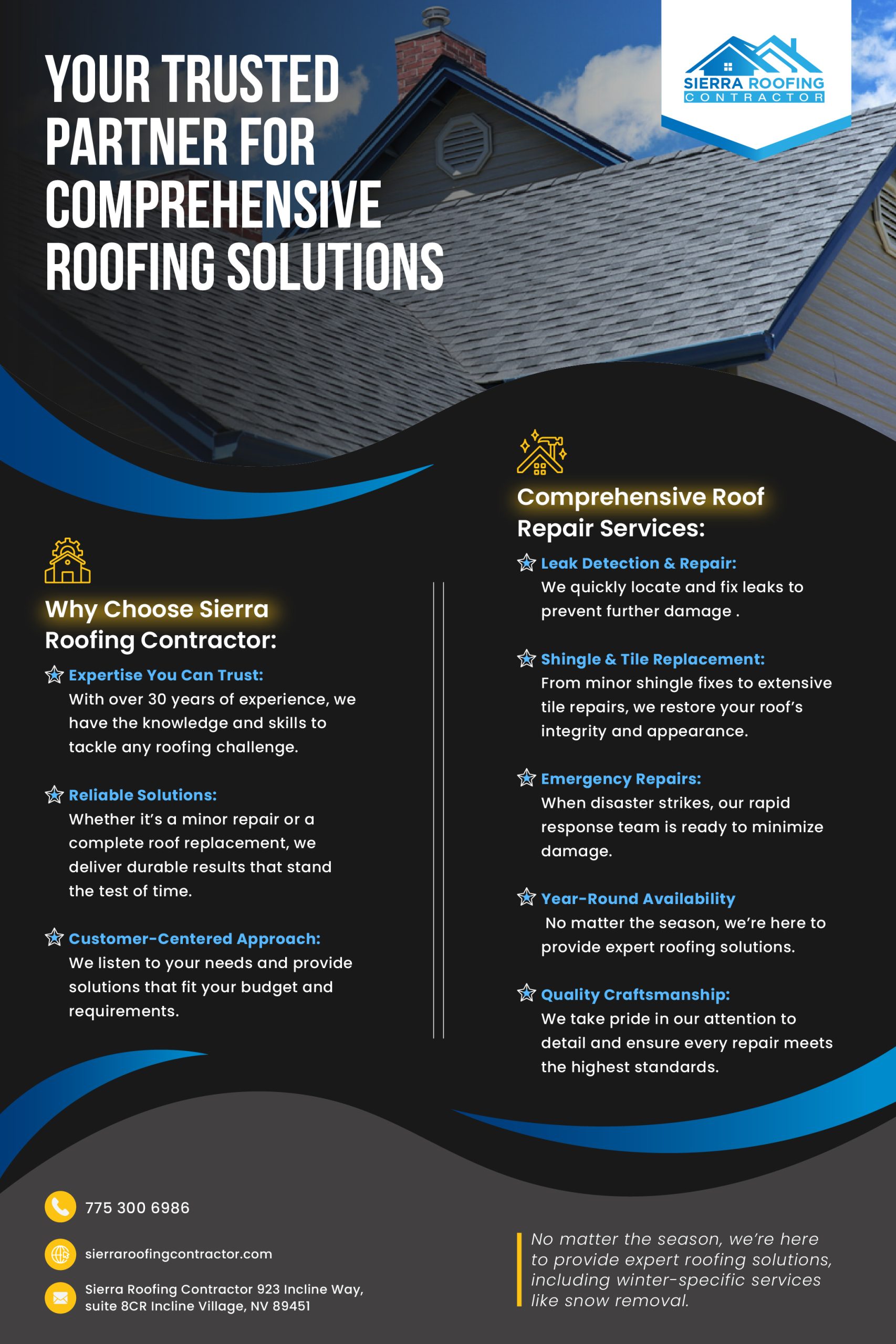 - Your Trusted Local Roofing Partner: We’re proud to be a part of the Incline Village community, and we’re committed to providing our neighbors with the best possible roofing services.